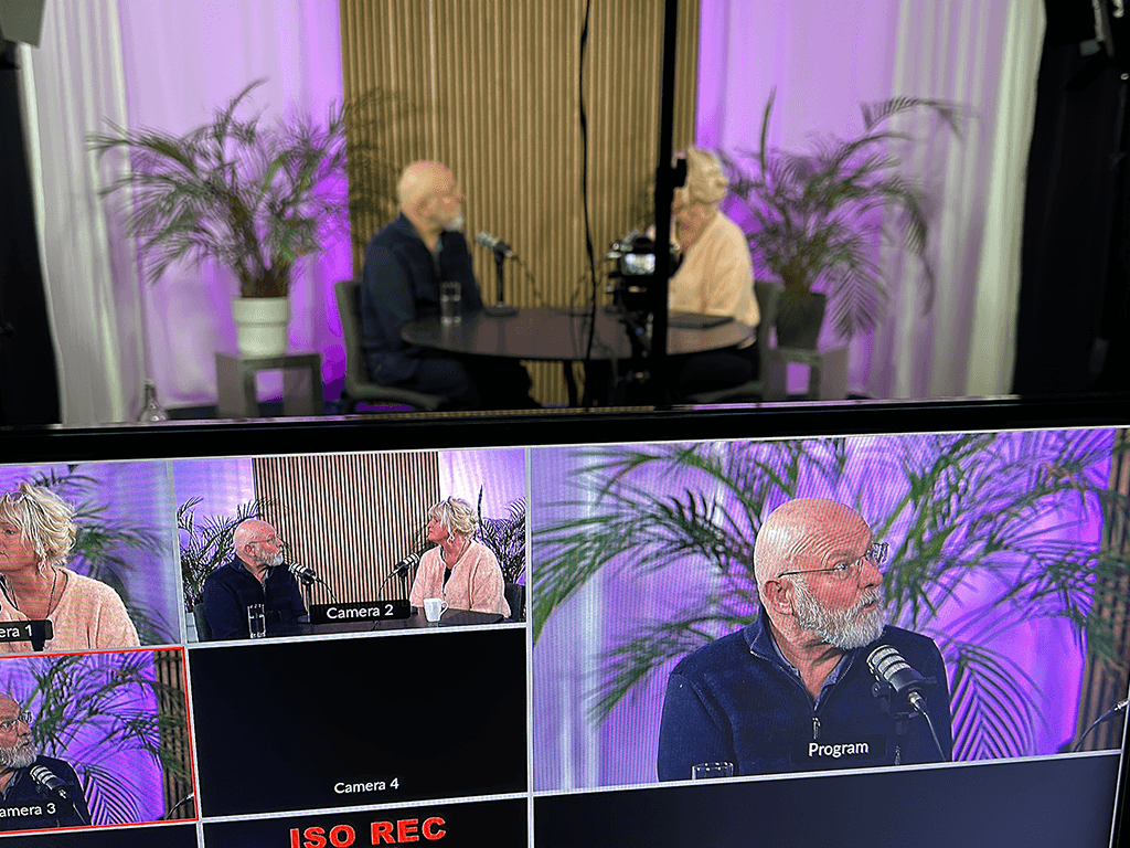 Je schuift aan in onze podcaststudio waar het geluid helder is en de sfeer zacht.